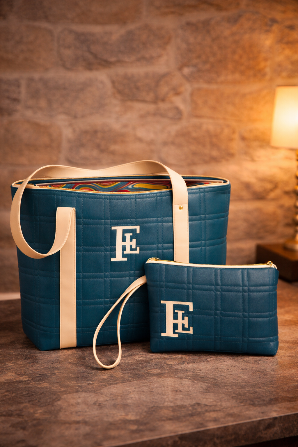 180 € Dimensions: 45x35x15 Fermeture zip argent Intérieur doublé Poche interieure zip Pochette assortie en option.